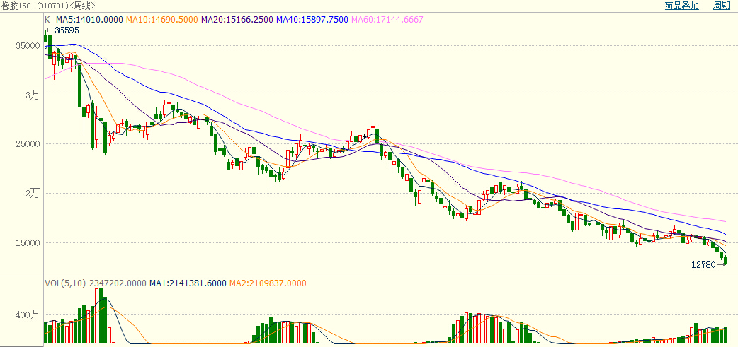 本周滬膠走勢(shì)延續(xù)前三周跌勢(shì),價(jià)格再創(chuàng)新低,主力合約跌破13000整數(shù)關(guān)口。近月合約1410價(jià)格收盤(pán)于11250,逼近11000,周跌505,跌幅為4.29%,1409周一以11775收盤(pán)完成全部交割。再看主力合約1501,本周開(kāi)盤(pán)13485,最高13750,最低12780,收盤(pán)12835,周跌685,跌幅為5.07%??偝謧}(cāng)為277072,較上周276098相差無(wú)幾。總成交量為234萬(wàn)手,較上周203萬(wàn)手有所提高。概括其表現(xiàn)為:前半周行情在13300上方震蕩欲反彈,但成交萎靡,量能不足。下半周則表現(xiàn)出反彈無(wú)力,行情繼續(xù)急劇下跌,周五更是逼近跌停的形勢(shì)收盤(pán)。其他月份合約均大幅下挫,跌幅均在5%左右,整體表現(xiàn)弱勢(shì)。