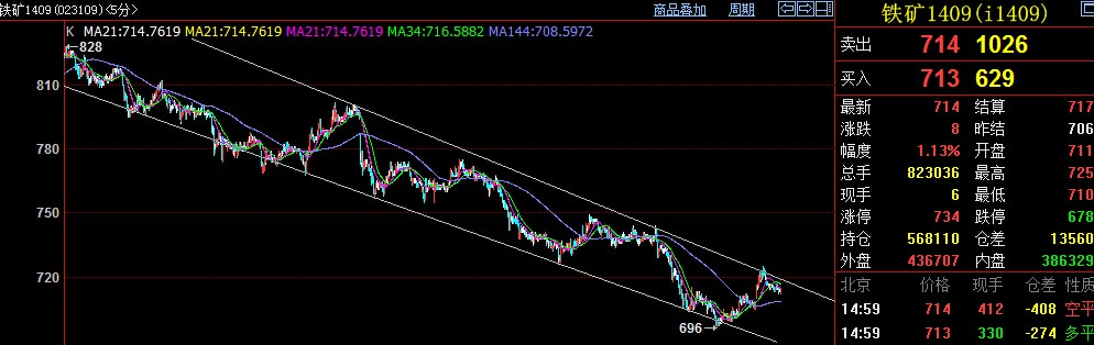 5月22日鐵礦石1409合約開盤后迅速拉漲,最高反彈至725(+19),午后漲幅收窄,報收于714(+8),幅度為1.13%,增倉1.35萬手,持倉56.8萬手。持倉前20名中,多頭持倉198793手(+10680),空頭持倉189451手(+26100),雖然依然多方占優(yōu),但優(yōu)勢正在削弱,值得關注是空頭第二名的永安期貨加空6710手總持倉22512手,但它仍為凈多頭,但凈多手數(shù)由昨日3665降至今日162手,另一個值得注意的是近期在黑色產(chǎn)業(yè)鏈上多次判斷準確的江西瑞奇,位列第十名加空2329手。