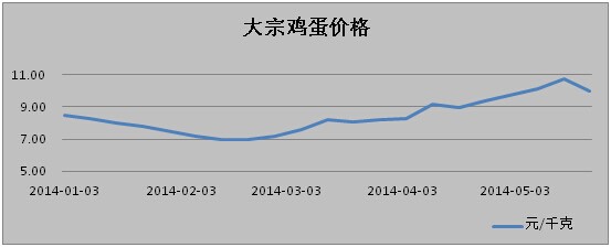 現(xiàn)貨報(bào)價(jià)方面,本周以跌為主,截止5月23日,大宗雞蛋報(bào)價(jià)由上周10.71元/千克,下跌至本周10.00元/千克,下跌幅度為6.62%。
