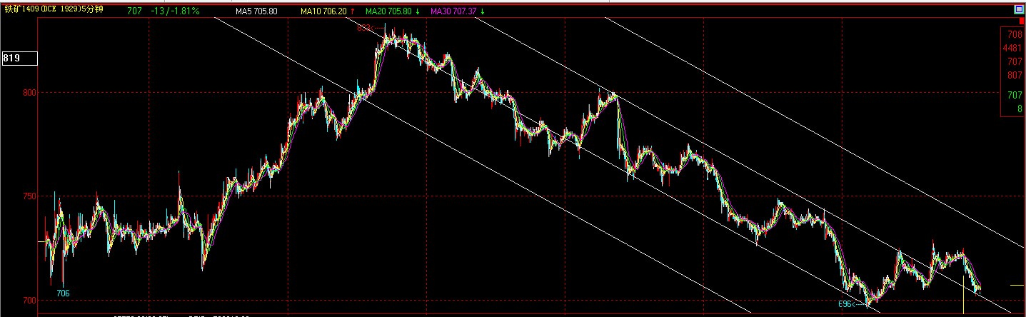 從短線五分鐘技術(shù)圖上來(lái)看,上方壓力較為明顯,昨日突破上行軌道變軌后,今天開(kāi)盤(pán)未觸及上軌便收到壓制掉頭,最高722后一路下跌。空頭反撲多頭增倉(cāng),尾盤(pán)出現(xiàn)少部多頭止損。短期基本面進(jìn)入產(chǎn)業(yè)淡季無(wú)支撐,配合技術(shù)面上方軌道線及反彈壓力位740附近一線壓制較大,主推日內(nèi)反彈至740附近能逢高輕倉(cāng)試空。因存在預(yù)調(diào)微調(diào)的政策預(yù)期,空頭不宜過(guò)分殺跌,700以下謹(jǐn)慎追空。新軌折返線支撐較為明顯,今日市場(chǎng)情緒來(lái)看,多頭信心不足,但未大規(guī)模割肉,明日日內(nèi)可背靠700輕倉(cāng)逢低做多,注意止損。