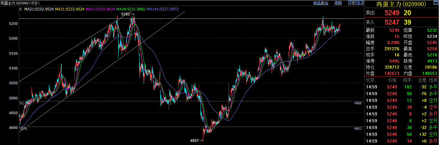 6月24日雞蛋1409主力合約開盤高開低走,開盤后最高上沖至5258,最低下探至5210,區(qū)間震蕩較大,尾盤拉升,報(bào)收于5249(+15),漲幅0.29%。持倉方面,今日增倉10106手,持倉328712手。持倉前20名中,多頭持倉83274(+1632)手,空頭持倉74383(+2529)手,多頭占優(yōu),其中多頭銀河期貨3350手(-1197),空頭申銀萬國5117手(+1276),增減倉規(guī)模較大。