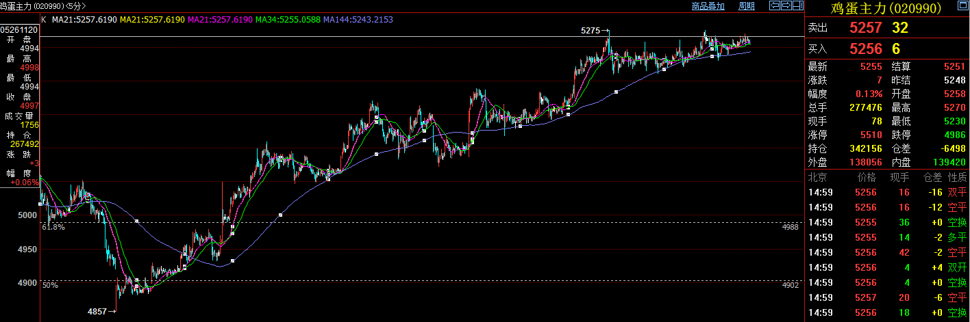 6月26日雞蛋1409主力合約開(kāi)盤(pán)高開(kāi)低走,開(kāi)盤(pán)后最高上沖至5267,最低下探至5230,隨后拉升,震蕩逐步走高,最高拉升至5270點(diǎn),尾盤(pán)小幅下探,報(bào)收于5255(+7),漲幅0.13%。持倉(cāng)方面,今日減倉(cāng)6498手,持倉(cāng)342156手。持倉(cāng)前20名中,多頭持倉(cāng)86725(-1742)手,空頭持倉(cāng)76170(-624)手,多頭占優(yōu),其中多頭永安期貨11336手(+1066),多頭中糧期貨3638手(+1016),多頭增倉(cāng)規(guī)模較大。