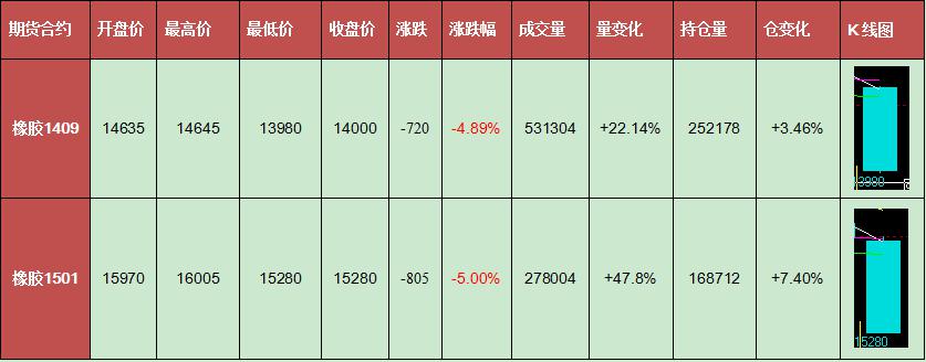 今日橡膠受日膠連日下跌影響,小幅低開(kāi)后持續(xù)下跌,10點(diǎn)后放量下跌,午后盤(pán)面延續(xù)價(jià)格下跌恐慌情緒,1501合約最終以跌停板收盤(pán),1409合約以接近跌停價(jià)格收盤(pán),跌幅達(dá)4.89%。成交量與持倉(cāng)量總體均呈上升趨勢(shì),1501合約放量下跌趨勢(shì)尤其明顯。日膠指數(shù)跌破200,跌幅達(dá)3.97%。