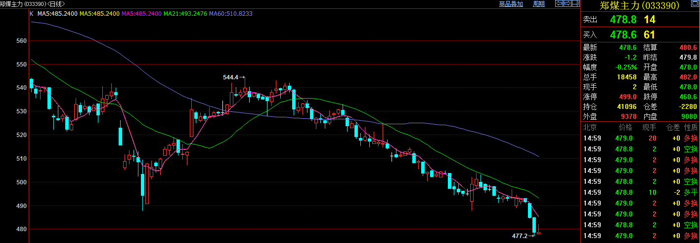 7月17日動(dòng)力煤合約1409合約大幅低開,隨后快速拉升至482,然后逐步跳水直至收盤。今日動(dòng)力煤雖沒有出現(xiàn)大幅下挫,但過山車的行情也顯現(xiàn)疲態(tài)。持倉(cāng)方面,持倉(cāng)41096手(-2280),持倉(cāng)前20名中,多頭15647手(-248),空頭16489手(-648),空頭占優(yōu)。