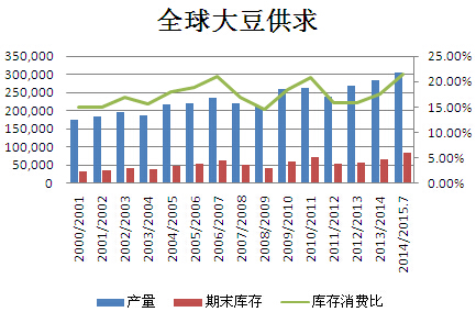從7月的美國農(nóng)業(yè)部報告來看,美豆新作產(chǎn)量因播種面積增加同比上升15%,環(huán)比上升4%。庫存消費比創(chuàng)2007/08年度以來的高位。而由于南美新作預計產(chǎn)量也會小幅增加,全球大豆產(chǎn)量達到創(chuàng)紀錄水平。而庫存消費比達到紀錄新高。全球大豆平衡表將重新調(diào)整,油粕價格也將重新定位。