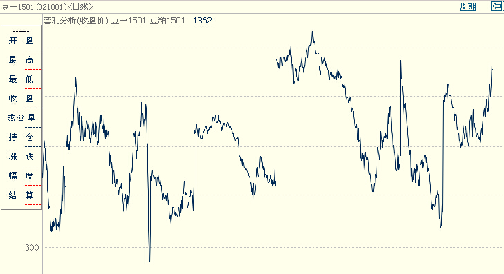 以上是大豆1501—豆粕1501套利價(jià)差圖(2007年-2014年)