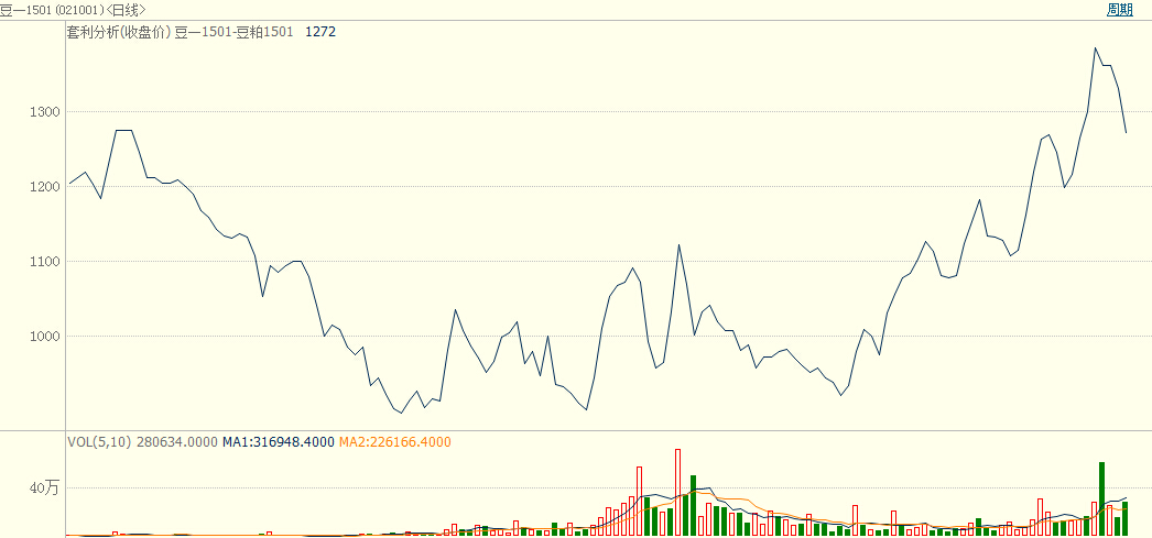 以下是大豆1501—豆粕1501合約圖(收盤價價差)