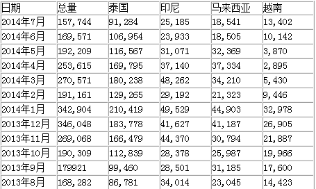 4.中國進(jìn)口橡膠創(chuàng)一年新低。最新數(shù)據(jù)顯示,2014年7月中國進(jìn)口橡膠總量達(dá)157744噸,中國橡膠進(jìn)口月度數(shù)據(jù)詳見下表。