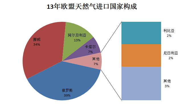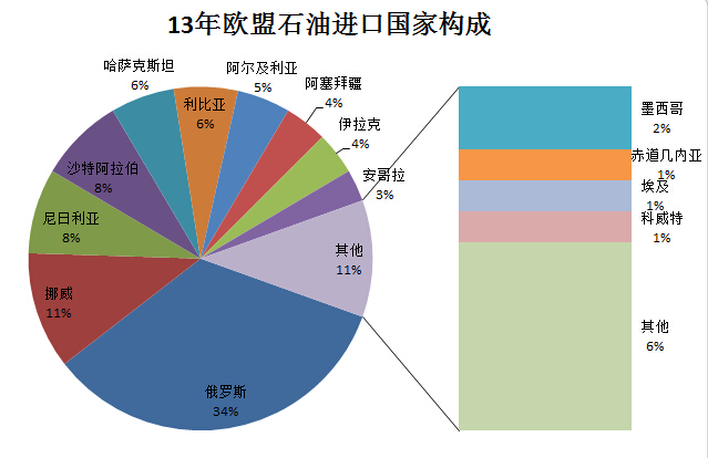 根據(jù)IMF數(shù)據(jù)顯示2013年歐盟以17.37萬億美元的GDP總量領(lǐng)先美國16.80萬億美元,保持世界第一大經(jīng)濟(jì)體地位。作為全球最大經(jīng)濟(jì)體,歐盟對油氣等資源有著巨大的需求,然而除北海周邊的英國,挪威,其他國家并沒有足夠的石油,天然氣資源。歐盟周邊地區(qū),油氣資源豐富的地區(qū)主要有四個(gè),南方的北非利比亞等國,東南方向的波斯灣地區(qū),東南方向的里海地區(qū),以及東方陸地相連的俄羅斯。下面兩張圖分別顯示了歐盟與各國油氣貿(mào)易所占比重