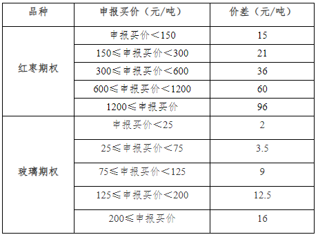 紅棗、玻璃期權(quán)合約最優(yōu)買賣報價價差小于等于下表價差時,不得詢價。