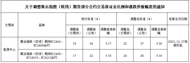 自2023年12月27日(周三)收盤(pán)結(jié)算時(shí)起,我司集運(yùn)指數(shù)(歐線)期貨EC2404、EC2406合約的交易保證金比例調(diào)整為27%,漲跌停板幅度調(diào)整為20%。