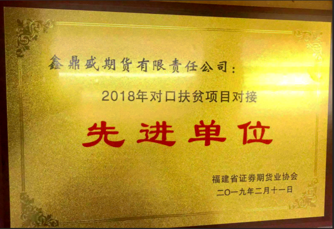 日前,福建省證券期貨業(yè)協(xié)會(huì)進(jìn)行2018年度對(duì)口扶貧項(xiàng)目對(duì)接表彰工作,對(duì)在扶貧工作中表現(xiàn)優(yōu)異的單位進(jìn)行表彰,授予鑫鼎盛期貨有限公司“先進(jìn)單位”榮譽(yù)稱號(hào)。