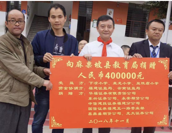 2018年11月,為響應(yīng)福建省證監(jiān)局、福建省證券期貨業(yè)協(xié)會(huì)的號(hào)召,鑫鼎盛期貨聯(lián)合福建轄區(qū)內(nèi)多家證券期貨公司,與國(guó)家級(jí)貧困縣云南省麻栗坡縣縣教育局簽訂結(jié)對(duì)幫扶協(xié)議。并積極籌措資金為改善當(dāng)?shù)刎毨W(xué)子學(xué)習(xí)環(huán)境奉獻(xiàn)微薄之力。
