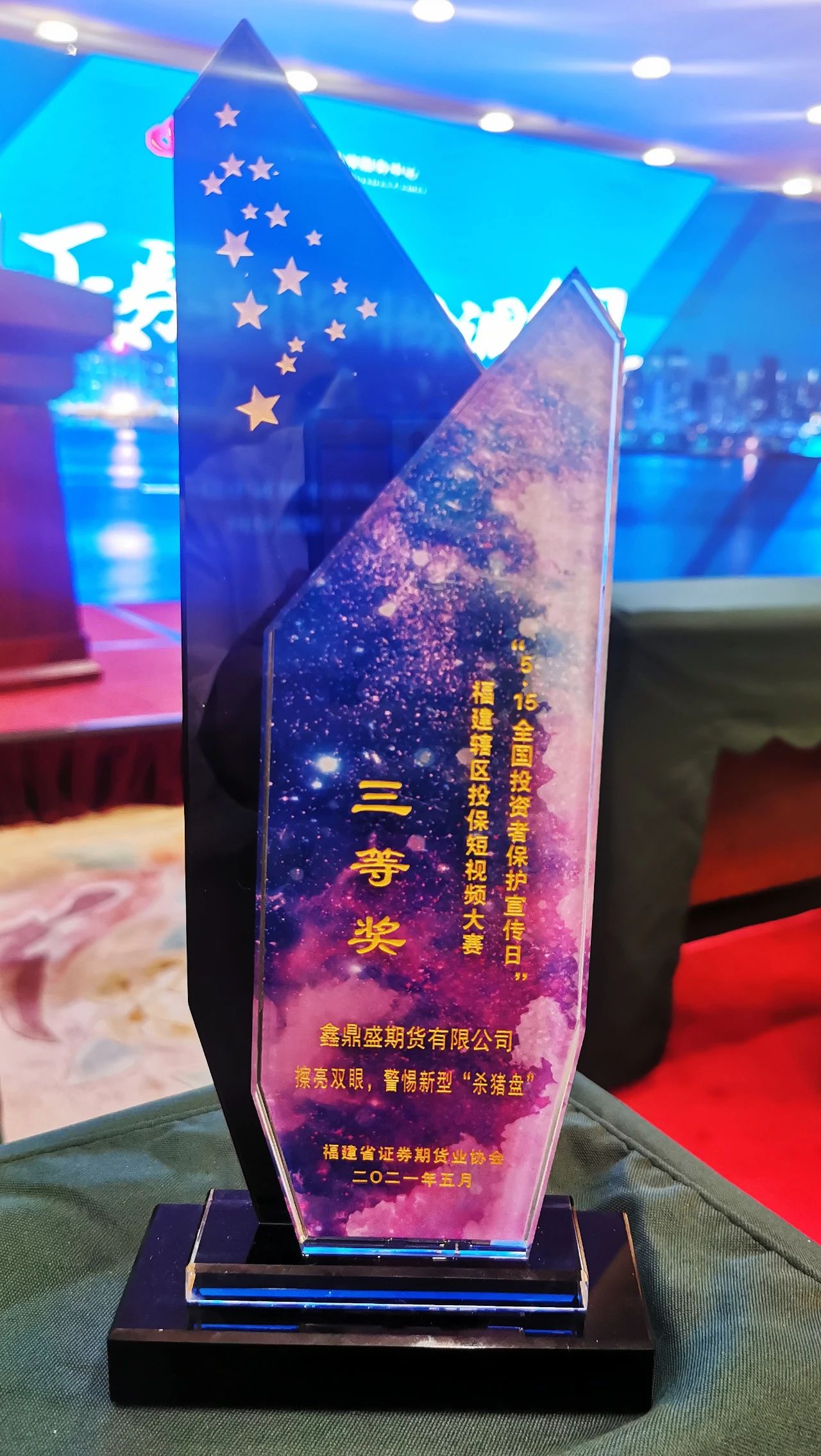 5月14日下午,福建省證券期貨業(yè)協(xié)會(huì)舉辦“5·15全國(guó)投資者保護(hù)宣傳日”福建轄區(qū)投保短視頻大賽頒獎(jiǎng)儀式,鑫鼎盛期貨有限公司參賽作品《擦亮雙眼,警惕新型“殺豬盤(pán)”》榮獲三等獎(jiǎng)。