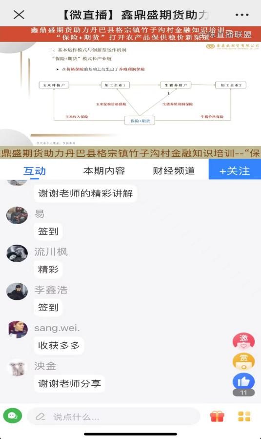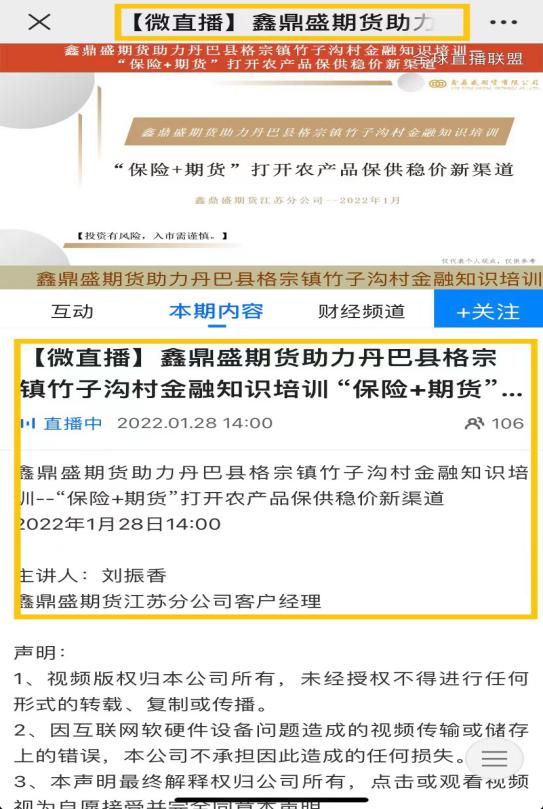 2022年1月,鑫鼎盛期貨有限公司與丹巴縣格宗鎮(zhèn)竹子溝村簽署幫扶框架協(xié)議,確立幫扶意向與幫扶方式。一是,鑫鼎盛期貨江蘇分公司與公司總部申請,向當?shù)刂苯泳栀?萬元用于扶持養(yǎng)殖產(chǎn)業(yè);二是,鑫鼎盛期貨江蘇分公司對接并介紹5名當?shù)貞艏脑谛4髮W生在公司實習;三是,鑫鼎盛期貨江蘇分公司開展“‘保險+期貨’打開農(nóng)產(chǎn)品保供穩(wěn)價新渠道”線上金融知識專題培訓,格宗鎮(zhèn)竹子溝村干部、養(yǎng)殖合作社帶頭人、鎮(zhèn)中心小學老師、當?shù)卮髮W生等20余人參加,引導廣大農(nóng)戶認識“保險+期貨”項目,提高農(nóng)產(chǎn)品價格風險管理意識。