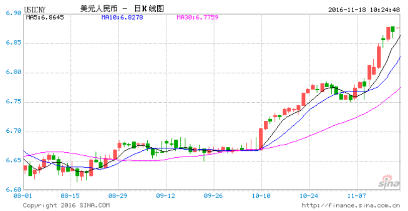 新浪財經(jīng)訊 11月18日消息,中國外匯交易中心公告,人民幣匯率中間價報6.8796,下調(diào)104個基點,連續(xù)第11個交易日下跌,再度創(chuàng)下2008年8月以來的新低。 11月17日晚,美聯(lián)儲主席耶倫在國會聽證時表示,特朗普當選美國總統(tǒng)沒有改變美聯(lián)儲“相對很快”升息的計劃,她還保證將完成任期。此番言論進一步提振了美聯(lián)儲下月加息的可能性,再加上強勁的美國經(jīng)濟數(shù)據(jù)的影響,美元指數(shù)擴大漲勢迫近101大關,人民幣因此承壓。