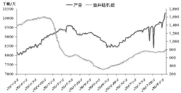 美國頁巖油產(chǎn)量持續(xù)上漲,據(jù)EIA數(shù)據(jù),2018年2月,美國頁巖油產(chǎn)量664.6萬桶/天,較上月大幅增加20.8萬桶/天,為歷史第二高單周增幅。EIA同時(shí)預(yù)計(jì)3月美國頁巖油產(chǎn)出將增長至675.6萬桶/天。2018年1月,頁巖油產(chǎn)區(qū)的鉆機(jī)數(shù)達(dá)到820臺(tái),較去年12月小幅增加9座。