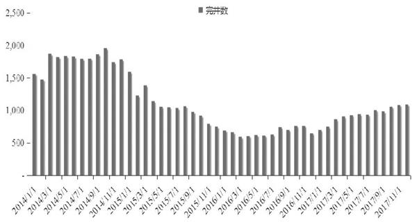 另外,雖然頁巖油庫存井仍然保持強(qiáng)勁的上漲勢(shì)頭,但完井投產(chǎn)的增速相對(duì)趨緩。2018年1月頁巖油庫存井7609口,較去年12月增加了121口;但直接完井投產(chǎn)的完井?dāng)?shù)增長相對(duì)較小,1月完井?dāng)?shù)僅增加34口至1125口。