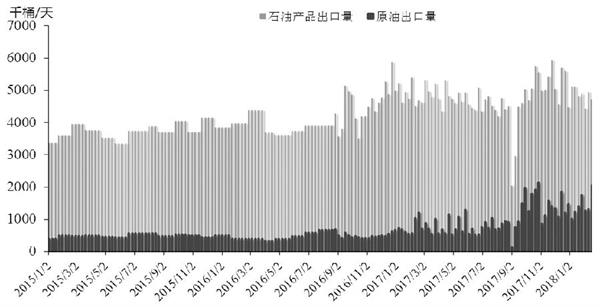 圖為美國原油及石油產(chǎn)品出口(單位:千桶/天)