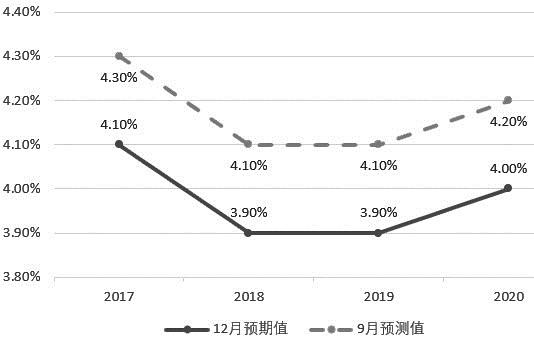 圖為美聯(lián)儲(chǔ)2017年9月和12月公布的真實(shí)GDP預(yù)測(cè)值對(duì)比
