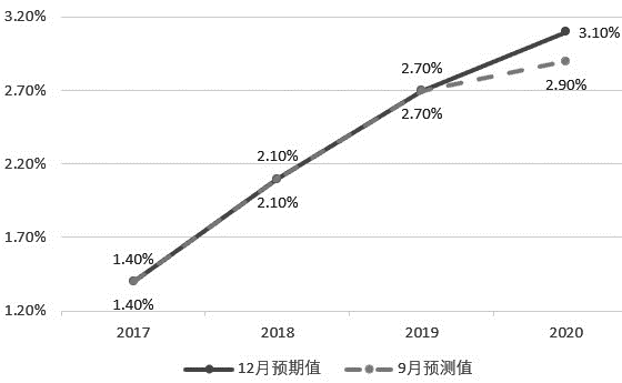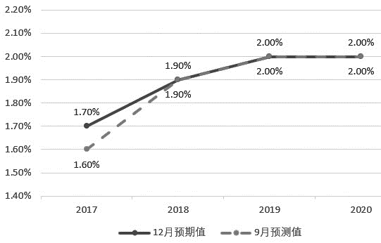 圖為美聯(lián)儲(chǔ)2017年9月和12月公布的PCE通脹預(yù)測(cè)值對(duì)比