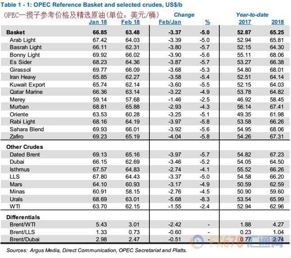歐佩克一攬子參考價格(OPEC Reference Basket)在2018年2月為六個月來首次下跌,跌幅5%,令均價降至63.48美元/桶,不過仍為逾兩年來最高均值水平。油價開始走軟主要受幾個方面的拖累,包括:美國原油生產(chǎn)逼近峰值水平,煉廠維修季來臨前原油需求看起來逐步減退,此外在美國公布了強(qiáng)勁的就業(yè)報告后美元大漲,也施壓以美元計價的油價。