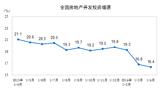 2014年1-4月份,全國房地產(chǎn)開發(fā)投資22322億元,同比名義增長16.4%,增速比1-3月份回落0.4個(gè)百分點(diǎn)。其中,住宅投資 15299億元,增長16.6%,增速回落0.2個(gè)百分點(diǎn),占房地產(chǎn)開發(fā)投資的比重為68.5%。