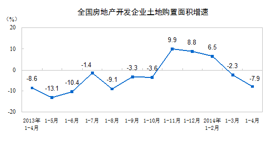 1-4月份,房地產(chǎn)開發(fā)企業(yè)土地購置面積8130萬平方米,同比下降7.9%,降幅比1-3月份擴(kuò)大5.6個(gè)百分點(diǎn);土地成交價(jià)款2214億元,增長9.6%,增速回落1.8個(gè)百分點(diǎn)。
