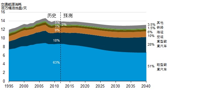 交通能源消耗,包括來自輕、重型車輛,飛機(jī)空運(yùn),輪船海運(yùn),鐵路運(yùn)輸?shù)炔煌\(yùn)輸工具在不同運(yùn)輸方式下產(chǎn)生的能源消耗。在美國(guó),2007年交通運(yùn)輸?shù)哪茉葱枨罅孔畲?,達(dá)到14.6百萬桶油當(dāng)量每天,2012年交通勻速的能源需求量達(dá)到13.8百萬桶油當(dāng)量每天。2012年,輕型載重車輛能源消耗量占交通運(yùn)輸全部能源消耗量的63%,到2040年這一比例有望降到51%。重型載重車輛的能源消耗比例可能從目前的18%上升到2040年的28%。輕型車輛的能源消耗未來下降主要得益于車輛能源效率的改善。